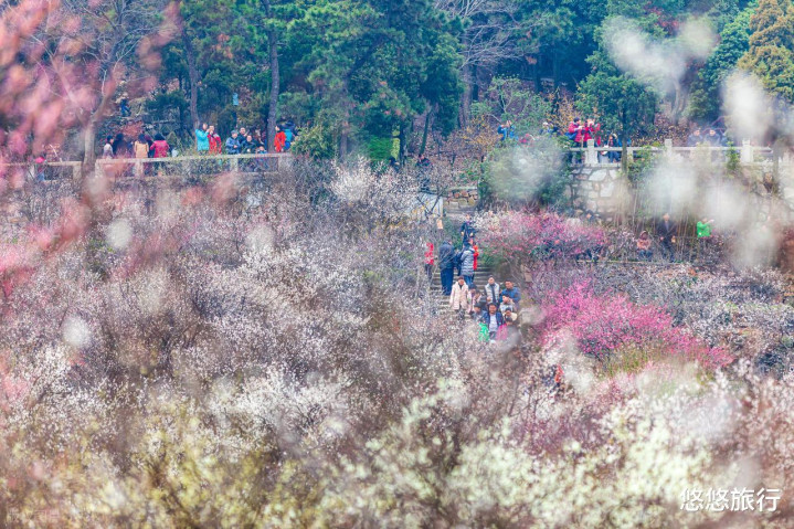 二月中旬梅花怒放,梅花山梅花品类多,早梅照旧洞开。梅岗的古典园林,有红梅、绿梅。