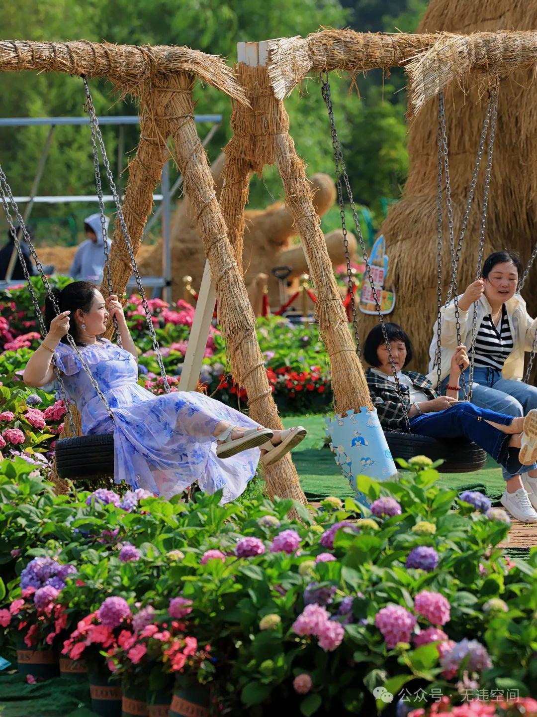 “奔来花展”花圃中,有的地点可以登高俯视扫数娇娆的绣球花圃,有的可以成为孩子躲猫猫的驻足宝地,还多情东谈主在秋千上晃悠悠地说着暗暗话。