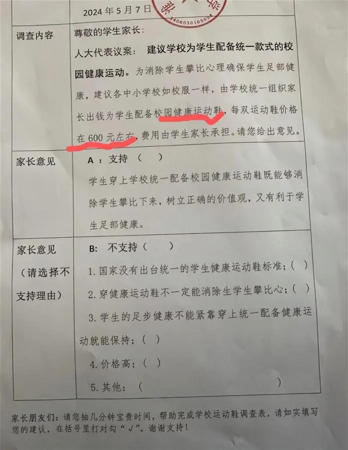 “尊敬的学生家长:东说念主大代表议案,建议学校为学生配备长入技俩的校园健康瓦解(鞋)。为摒除学生攀比心扉,确保学生足部健康,建议各中小学如慑服相似,由学校长入组织家长出钱为学生配备校园健康瓦解鞋,每双瓦解鞋价钱在600元操纵,用度由学生家长承担。请您给出见解。”5月7日,安徽淮北一位网友在网上发布了一张访谒表,激励网友热议。该网友称,这是淮北市一所小学向学生家长披发的访谒表。