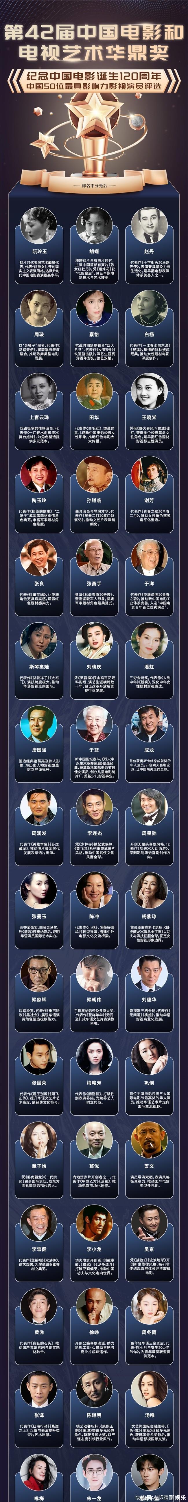 这份 50 东谈主榜单号称一部浓缩的中国电影发展史。榜单中华鼎奖以演员为行踪,了了勾画出华语电影 120 年的灿烂征途。