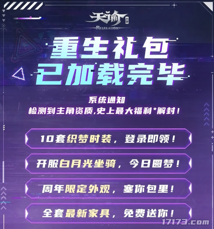 2026年1月9日《天谕》手游开启五周年仪式,绑定主角荣达条约,领取十套绝好意思时装、白蟾光坐骑、五周年适度外显,体验全新副本绯影殿堂和家园躲猫猫。