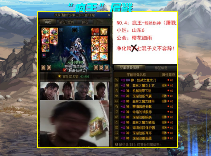 【4】“疯王”夷戮。这应该是跨七大区,最着名的一位“天王”,曾经凭借一己之力,要去“净化”团本中的“混子”,并喊出了“义摧残辞”的标语。