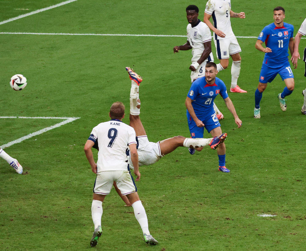 6月30日,英格兰队球员贝林厄姆(中)在比赛中倒钩射门得分。新华社记者 张帆 摄