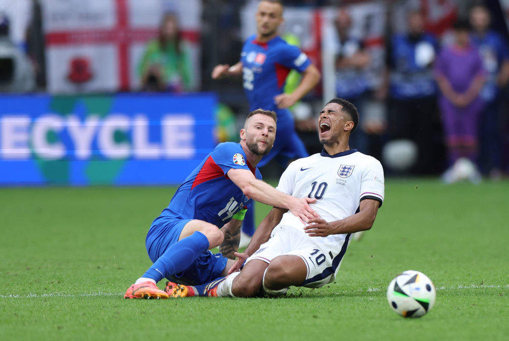 6月30日,斯洛伐克队球员什克里尼亚尔(左)在贯注英格兰队球员贝林厄姆时犯规。新华社记者 白雪飞 摄