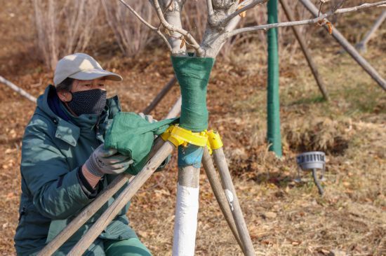 植物养护相同考究,厚朴、玉兰等畏寒树种穿上防寒布“寒衣”,缠干保湿防病害;新栽植的蒙古栎通过夯实泥土牢固根基,修剪枯枝病枝,减少营养虚耗,为来岁孕育蓄力。